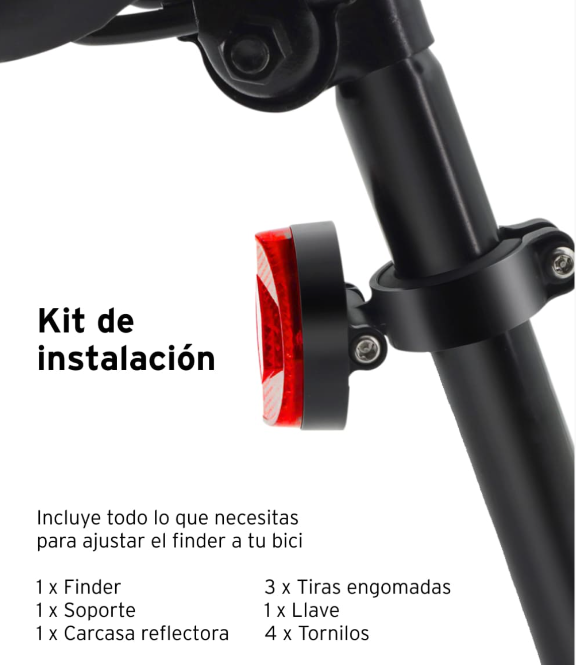 Detrás de su apariencia de luz reflectora se esconde un accesorio para tu bici que te permitirá mantenerla siempre vigilada y con la que podrás alertar a los conductores de tu presencia. Coloca el finder entre cada una de las carcasas, une las partes con la ayuda de los tornillos, escoge la cinta que mejor se adapte a la tija de tu bici… ¡Y pedalea con 0 preocupaciones!